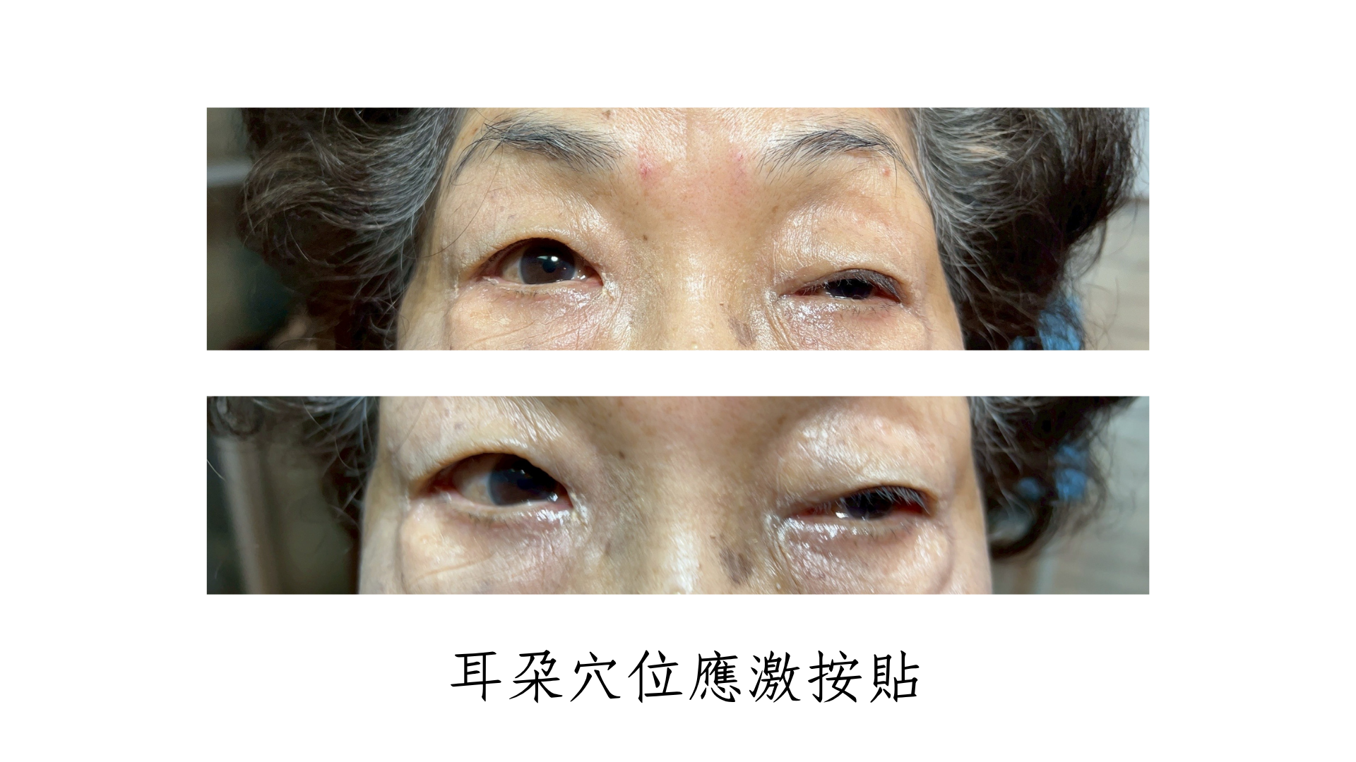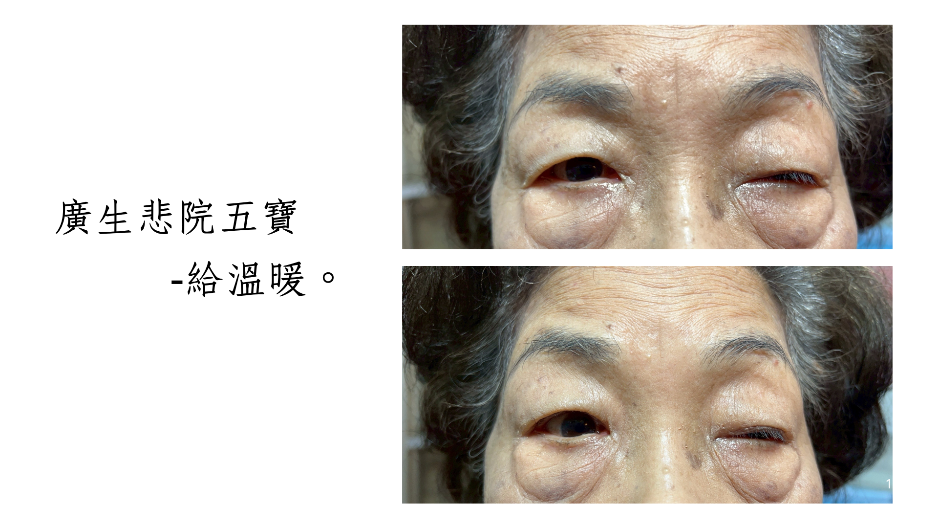 觀相:消瘦、蒼白、體況行動步履不穩、氣衰力弱、左眼眼臉張不開。
